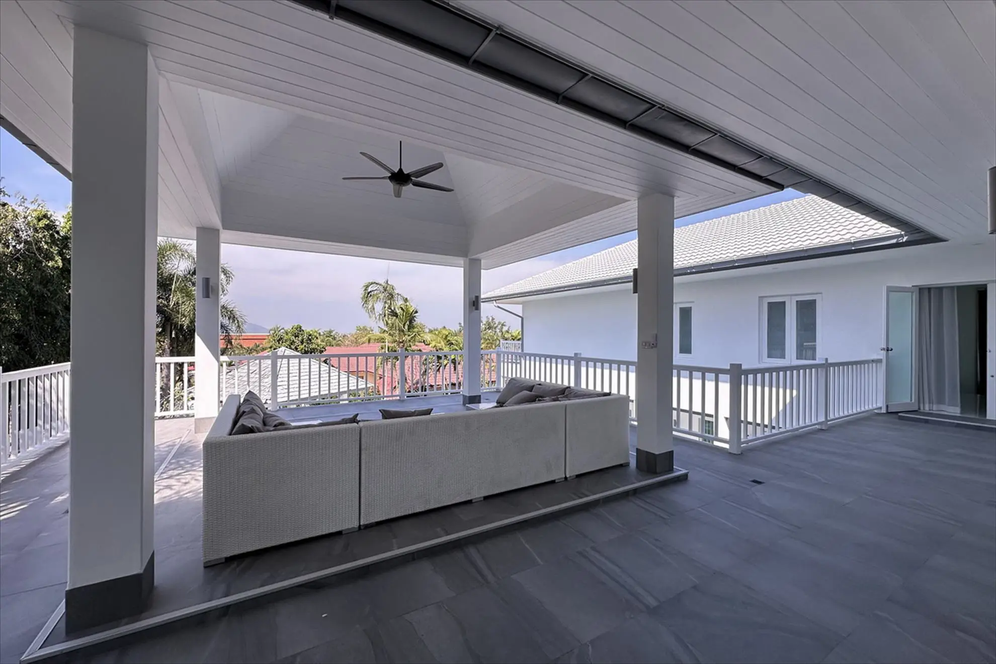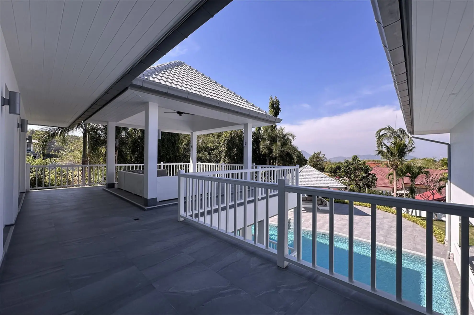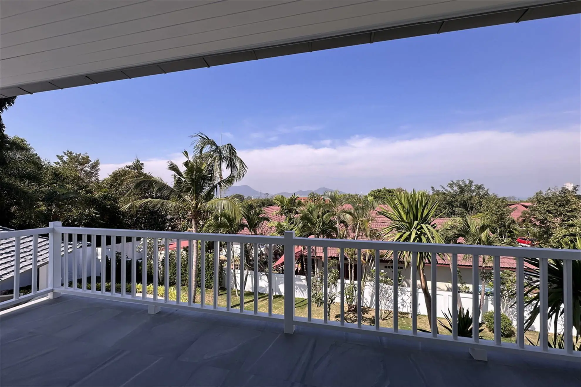 The 1st floor includes a landing area that leads to a large, covered balcony overlooking the garden and swimming pool, with stunning mountain views.
