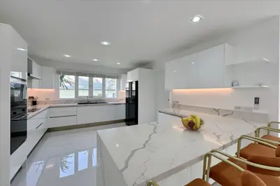 The European kitchen is equipped with granite countertops, a breakfast bar, electric hob, oven, extractor hood, fridge-freezer, and microwave.