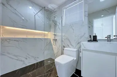 The 3rd Bedroom is spacious and includes access to the balcony, built-in wardrobes, and an ensuite bathroom with a separate bathtub and rainfall shower.