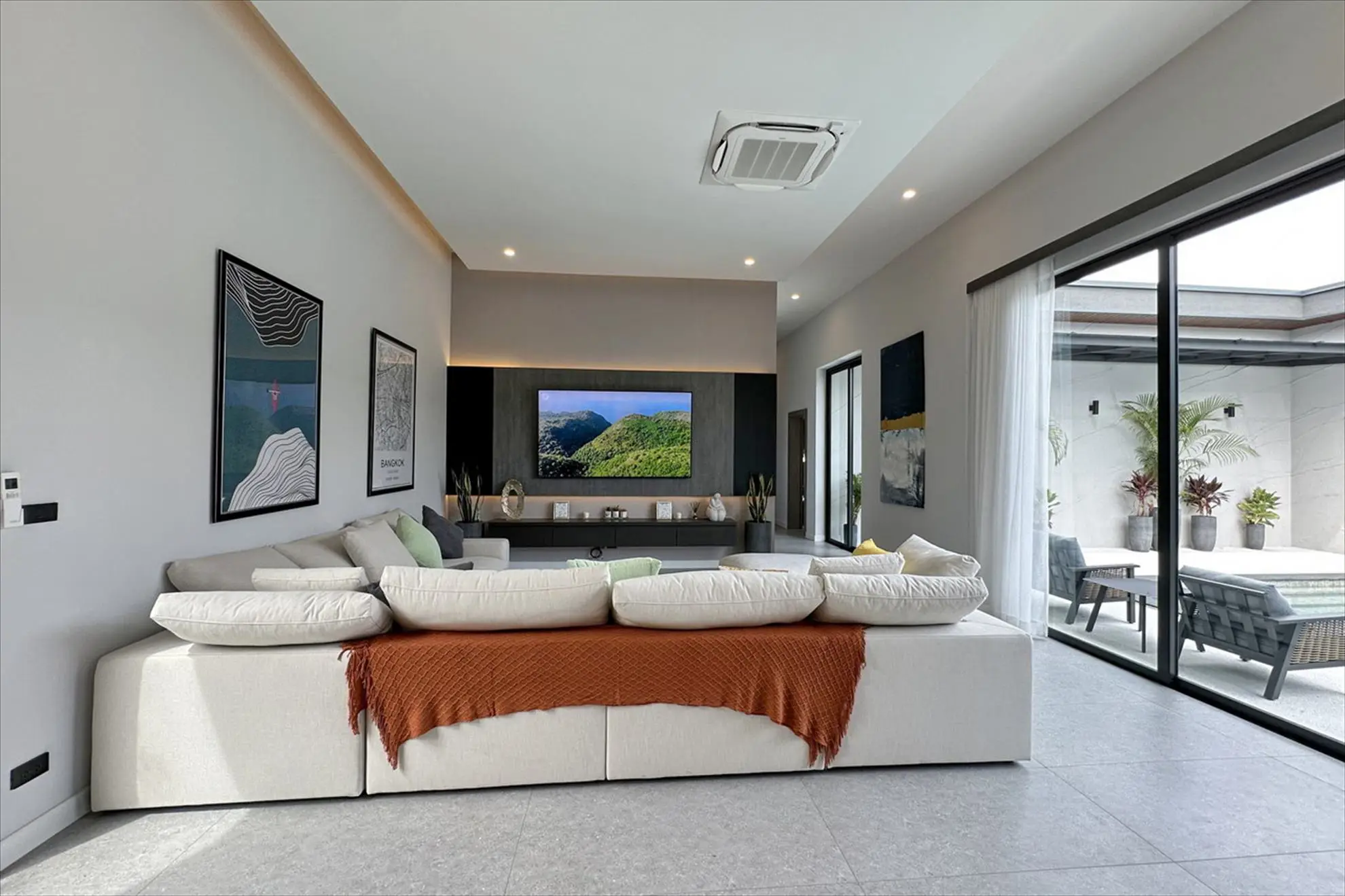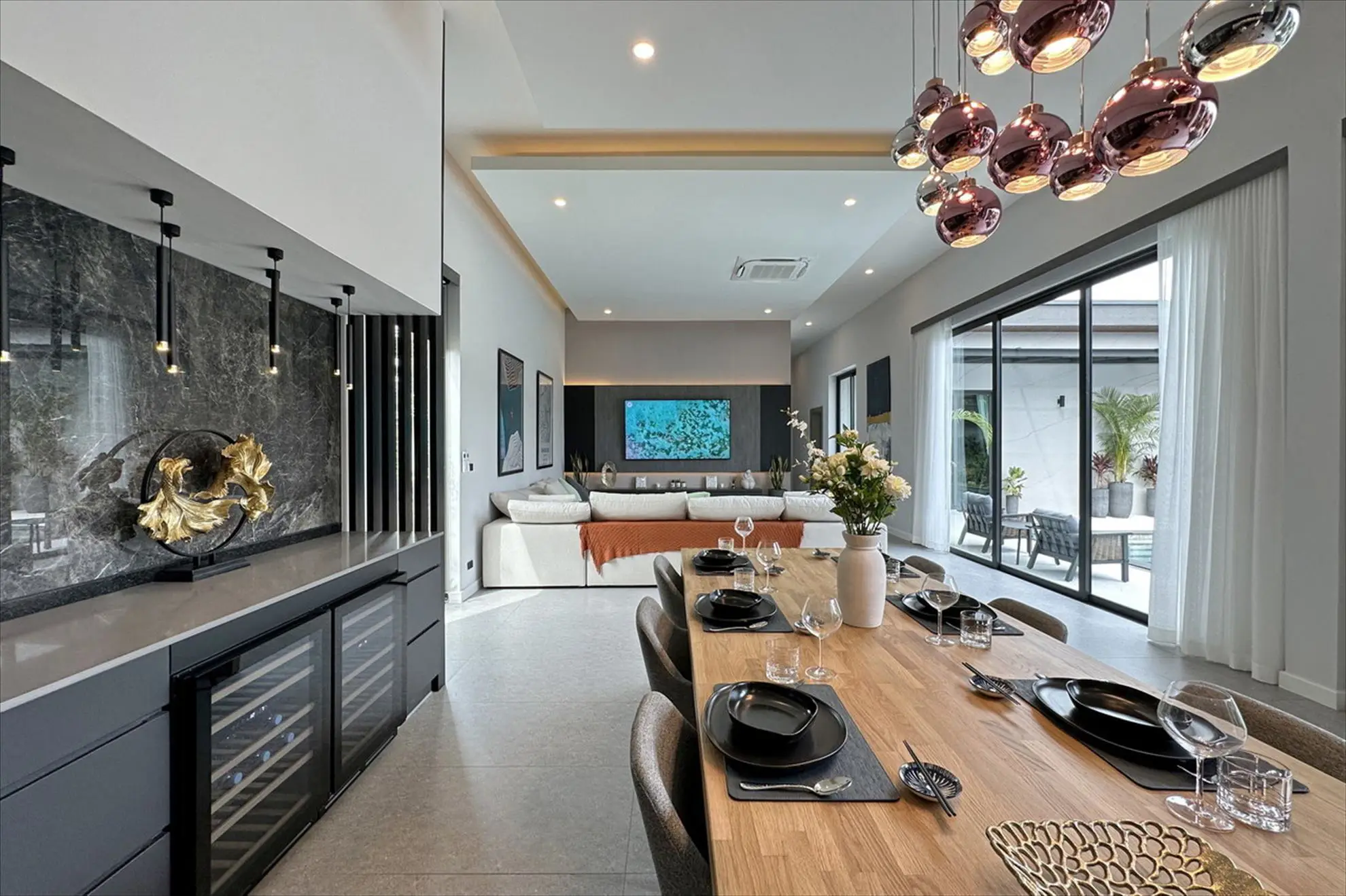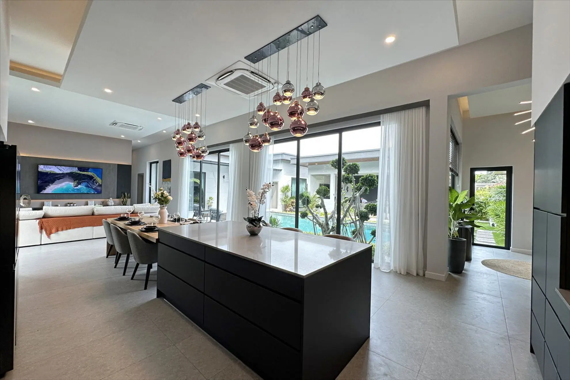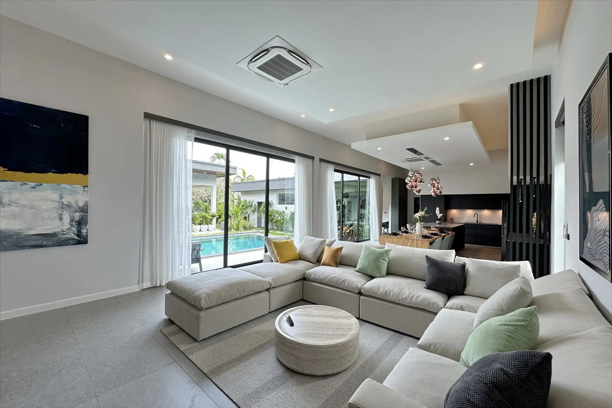 With high ceilings and large windows, the space is filled with natural light and opens directly to the garden and pool area, creating an effortless flow between indoor and outdoor living.