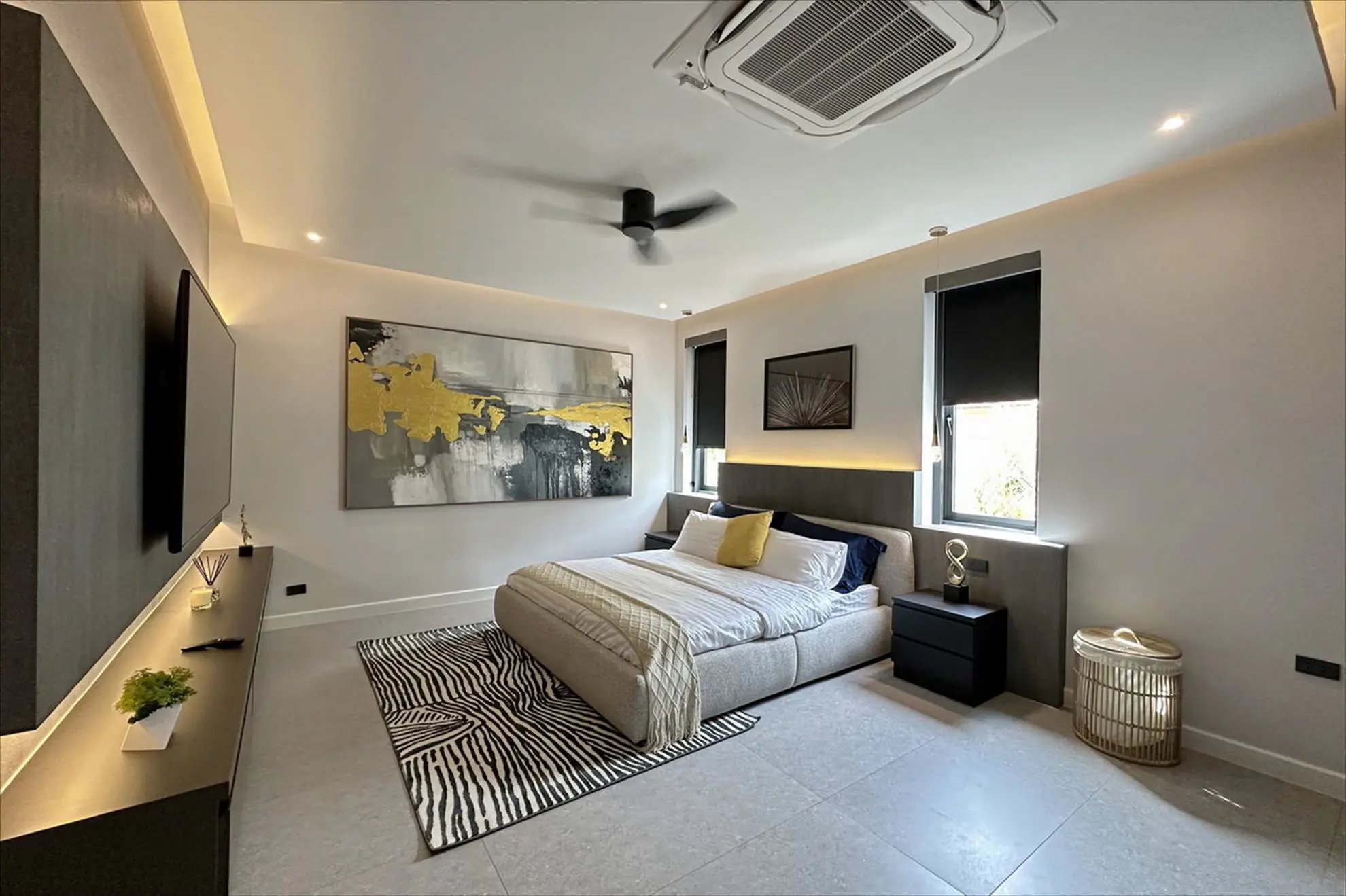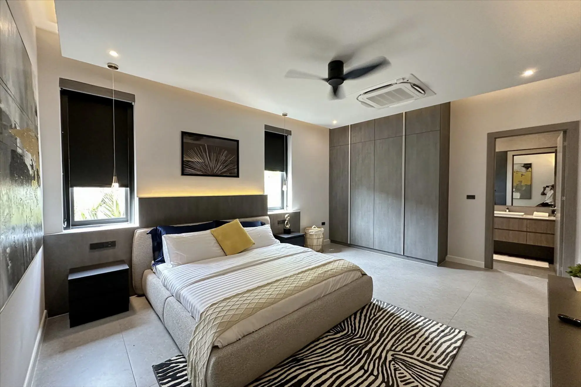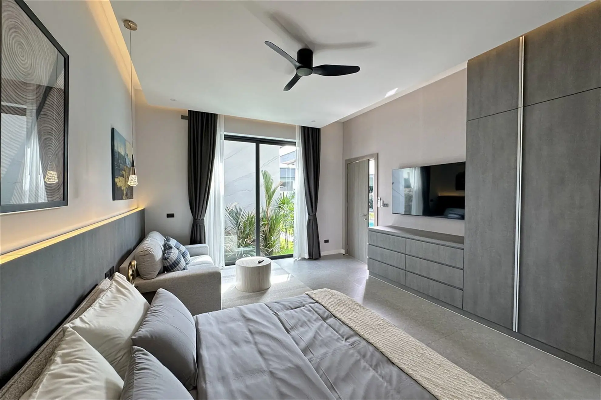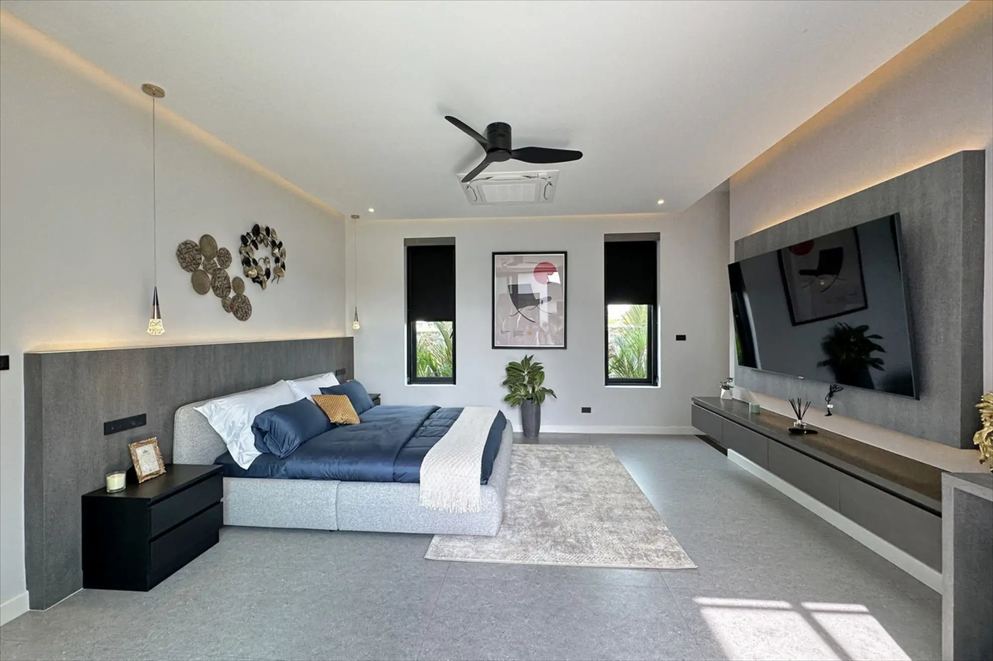 A smart home system and CCTV provide security and convenience, while electric sheers, custom lighting, and unique design elements add to the villa's luxury appeal.