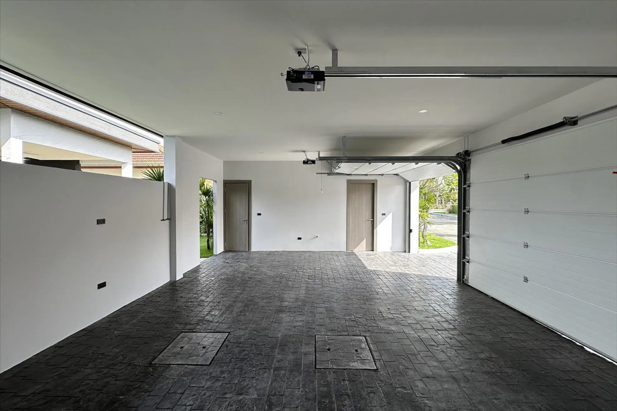 Three-car garage with electric doors