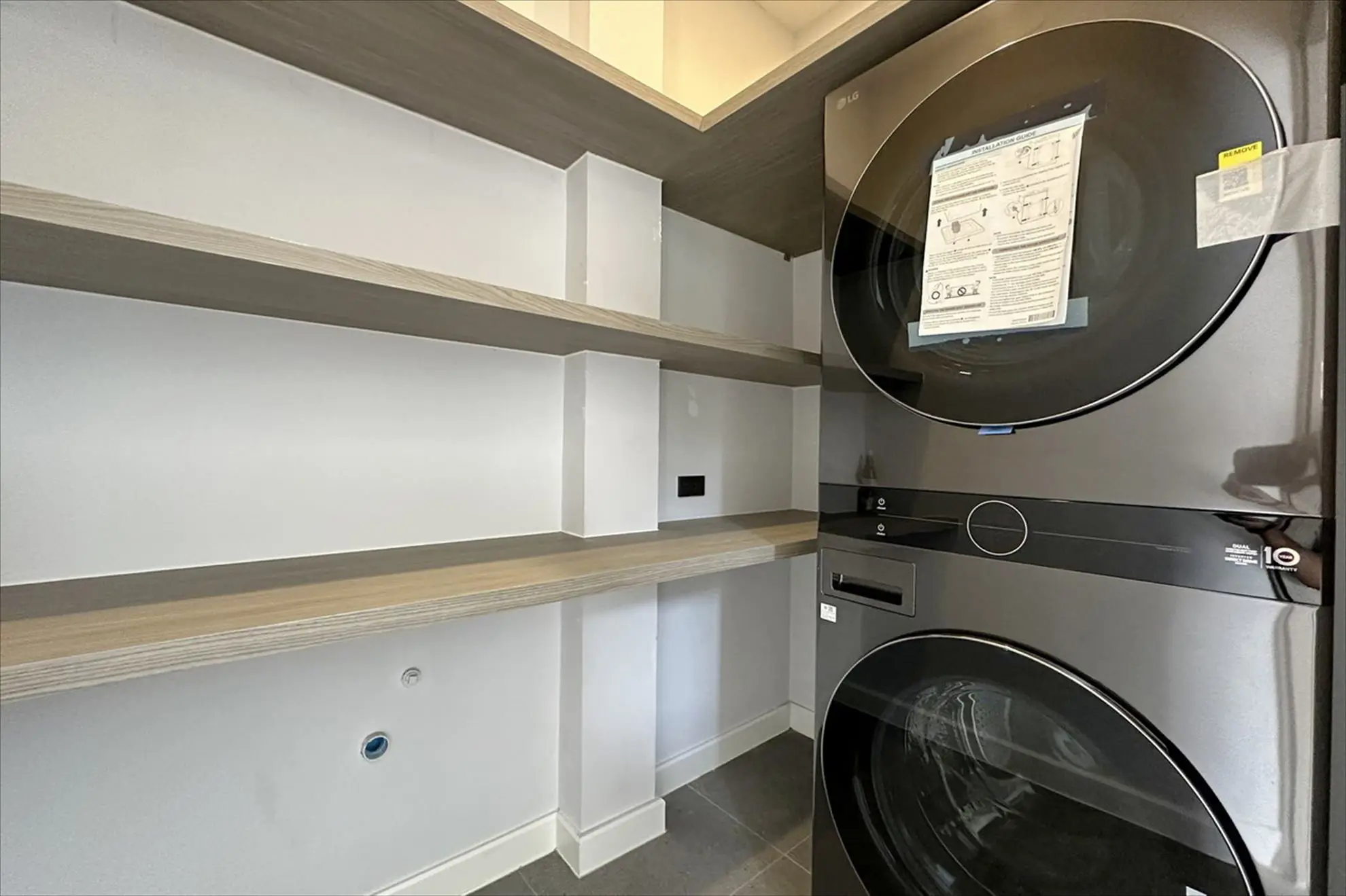 Fully equipped laundry room with a 23kg stacked washer and a 16kg dryer
