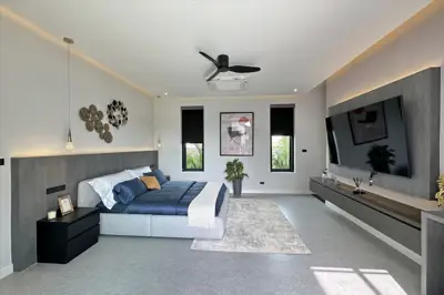 The villa is constructed with double-block cavity walls and PU foam insulation, ensuring superior energy efficiency and soundproofing. High ceilings, reaching up to 4 meters in the main living area, create a bright and airy atmosphere.