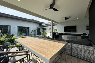 A large covered outdoor BBQ area includes a dining and living space, ideal for alfresco meals and entertaining.