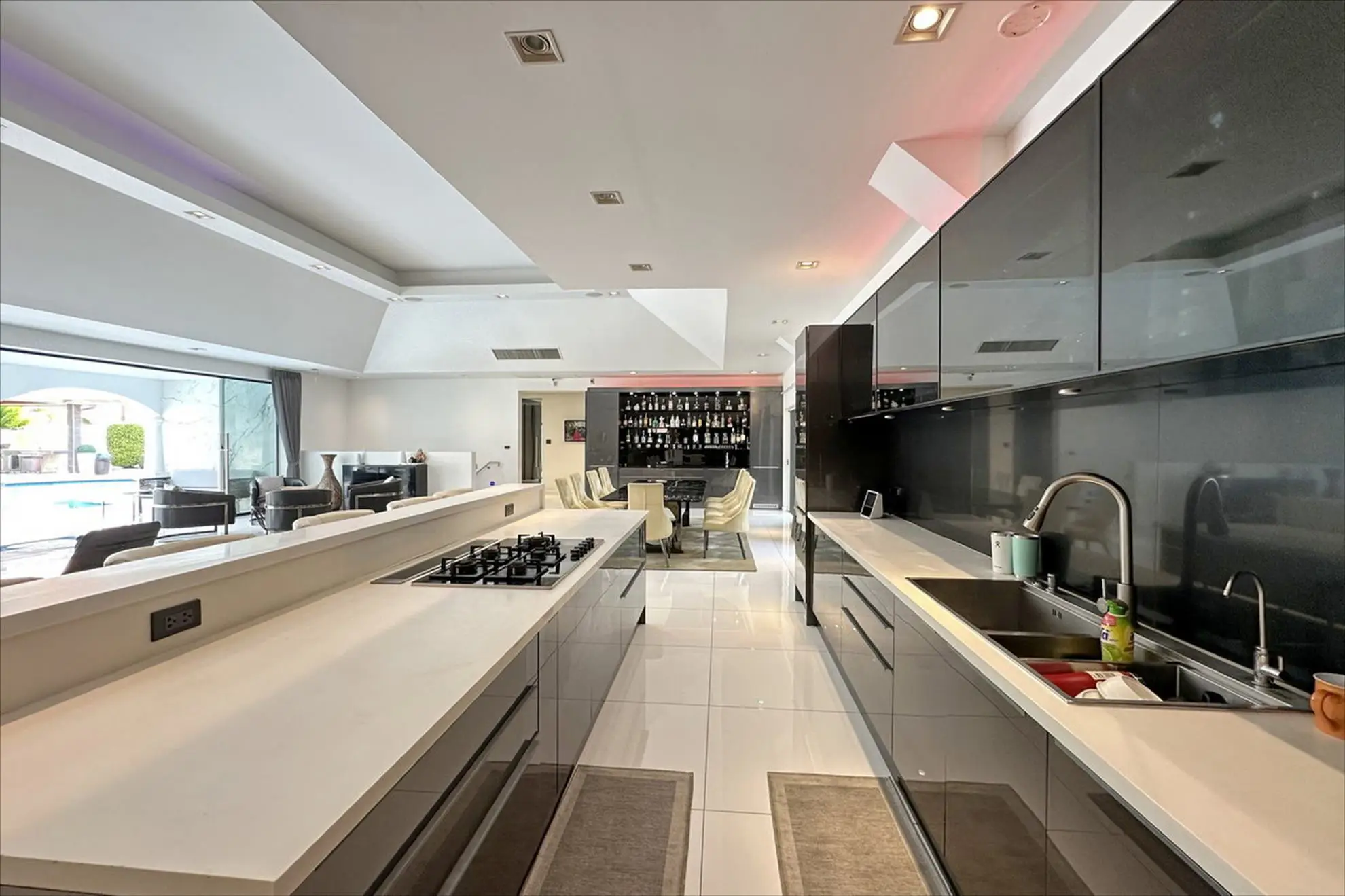 The European kitchen is beautifully designed with an island-style breakfast bar, high-end appliances, and ample storage.