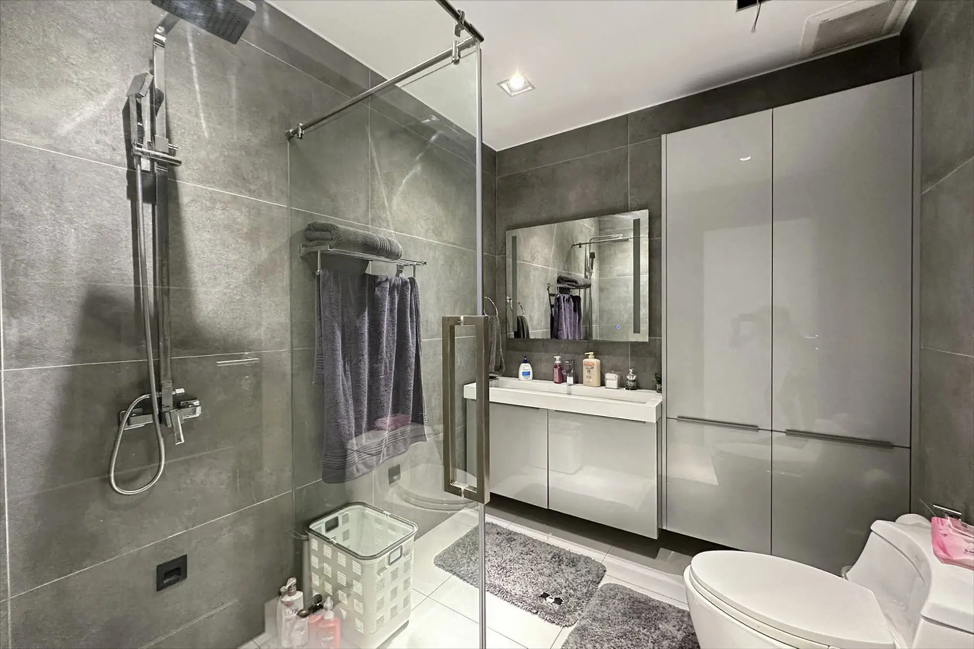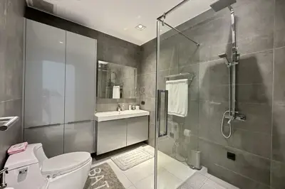 The master bedroom suite is a private retreat, offering a walk-in closet, a spacious dressing area, and an ensuite bathroom with a jacuzzi bathtub, twin toilets, and a rainfall shower.