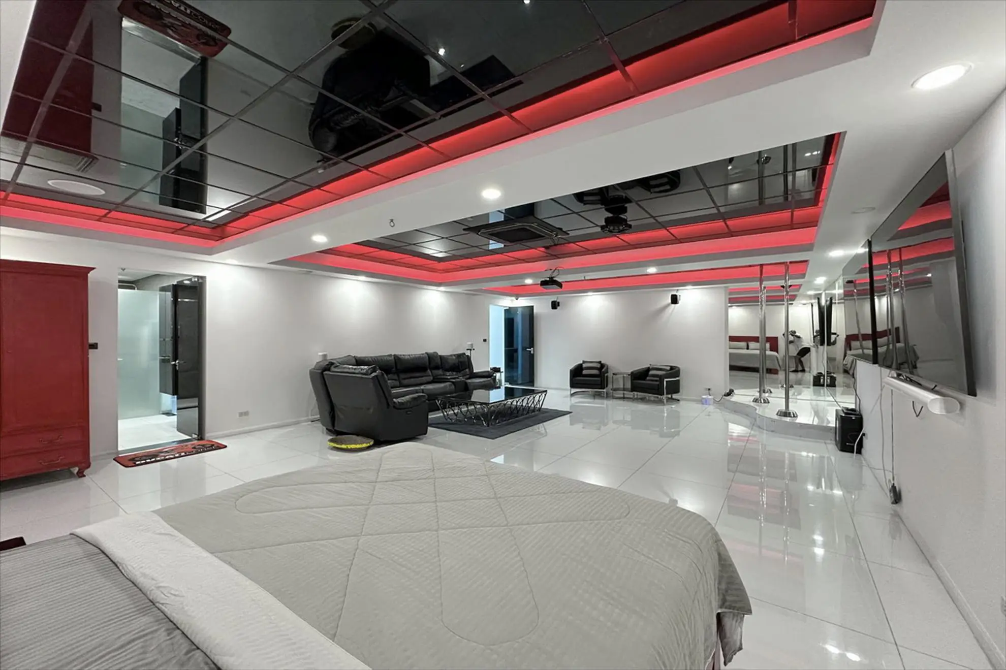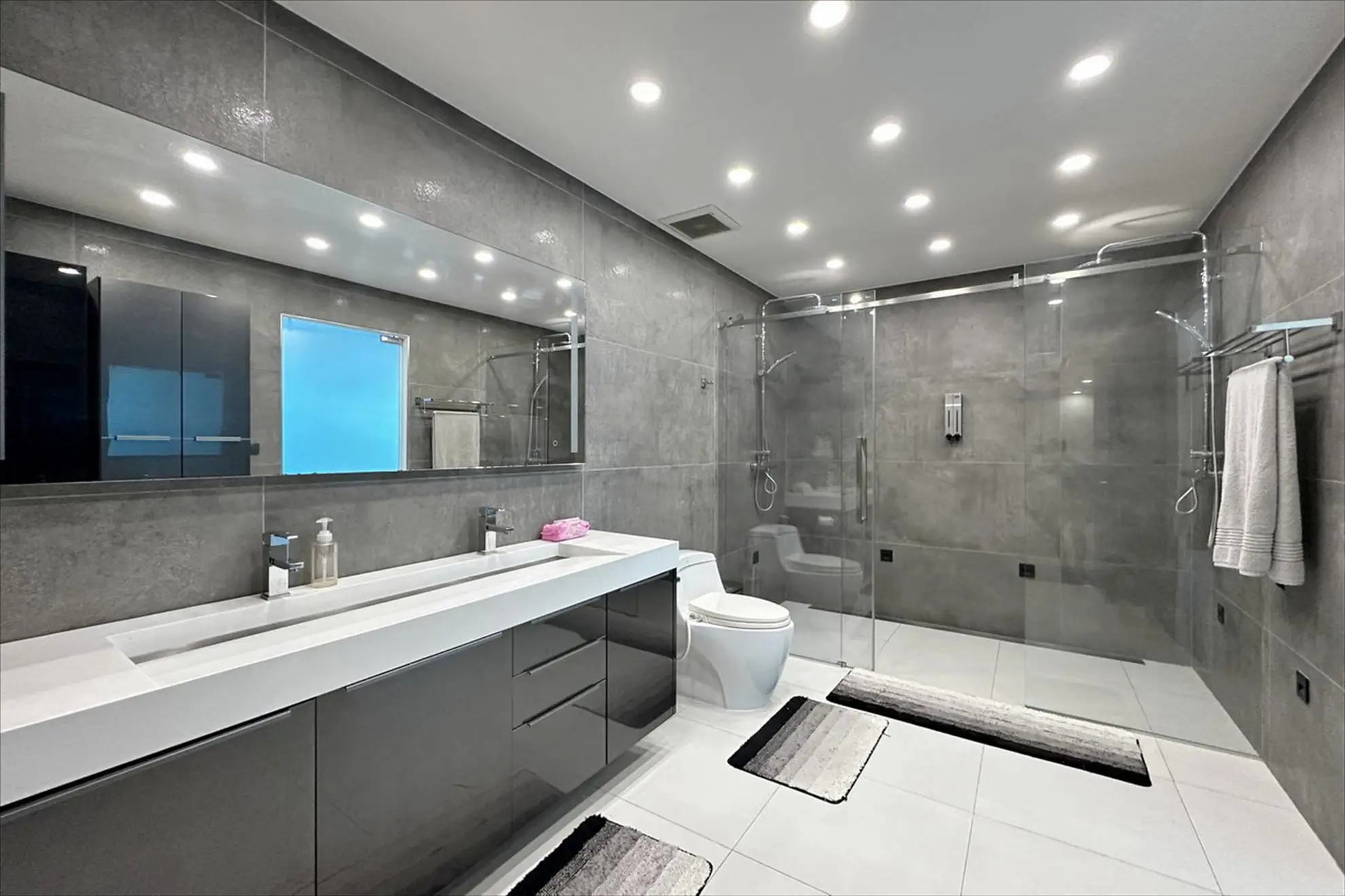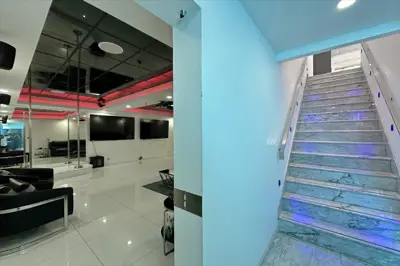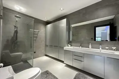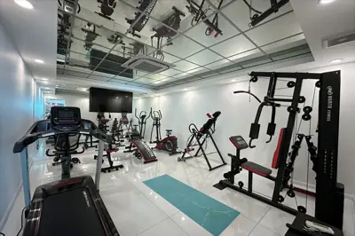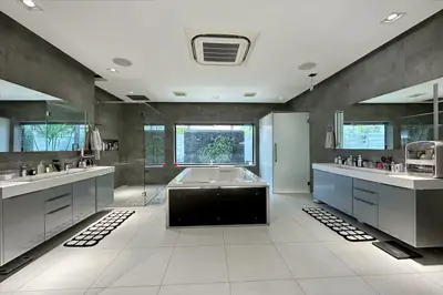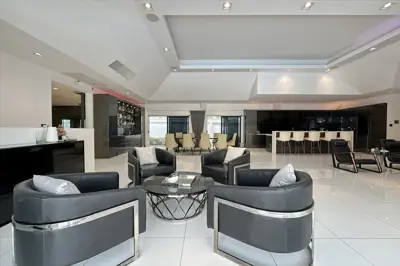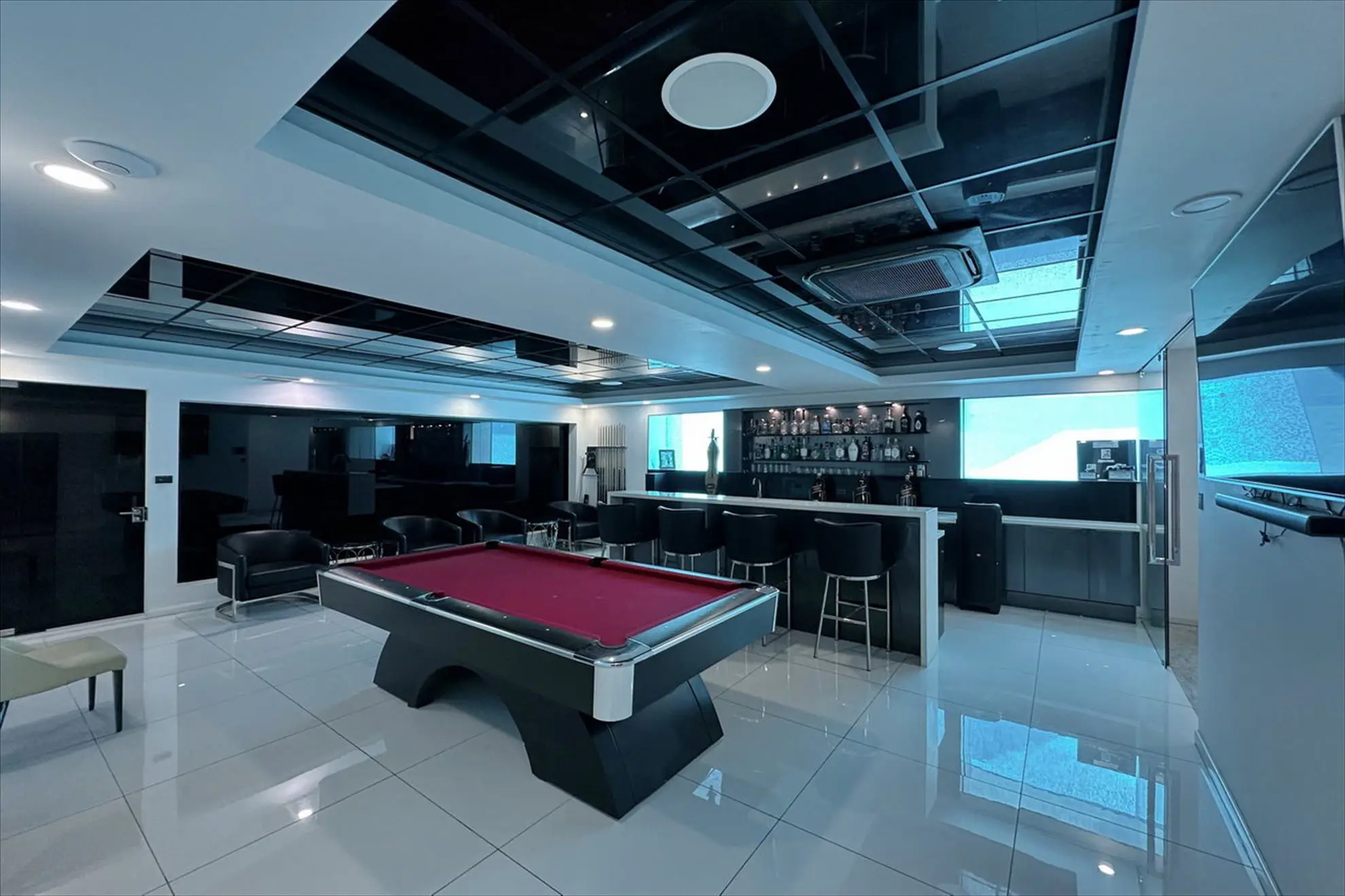 The lower floor is dedicated to leisure and entertainment, featuring a fully equipped gym, a stylish games room with a bar, a party room, and an additional bathroom with twin rainfall showers.