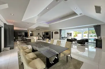 The main living area is bright and open, featuring a spacious lounge and dining area with large patio doors that lead to the tropical garden and private swimming pool.