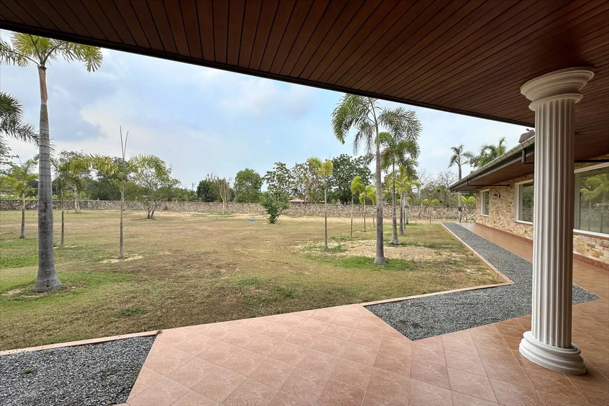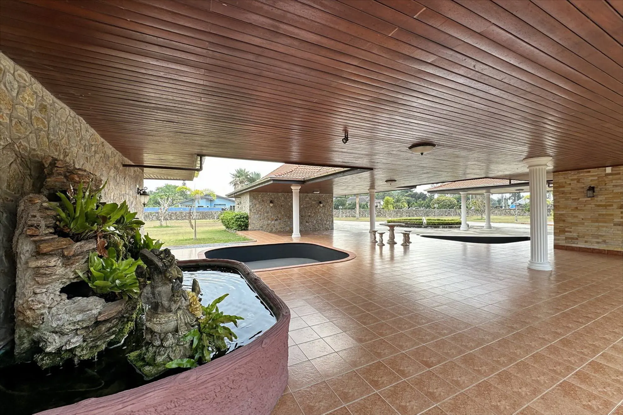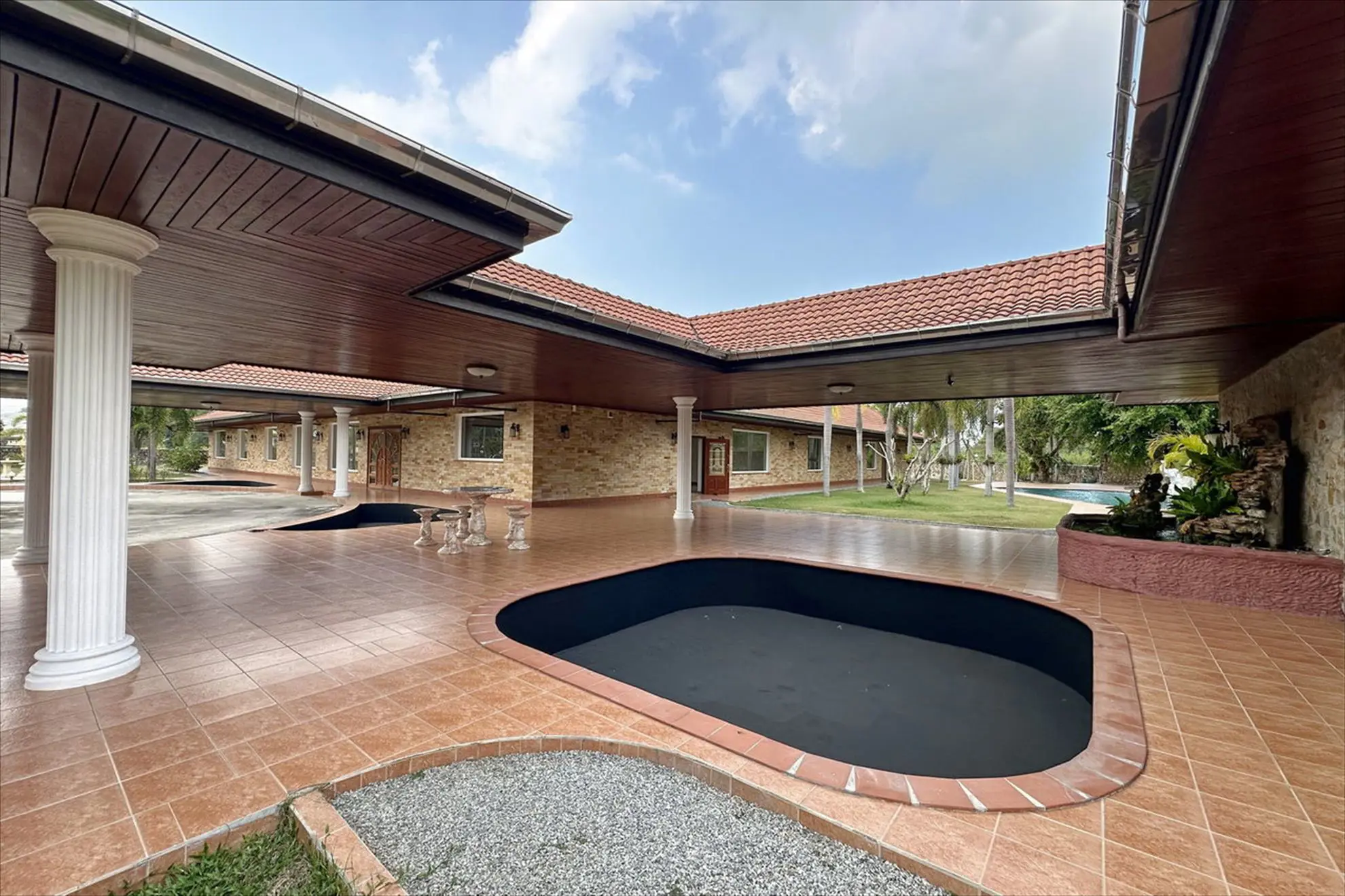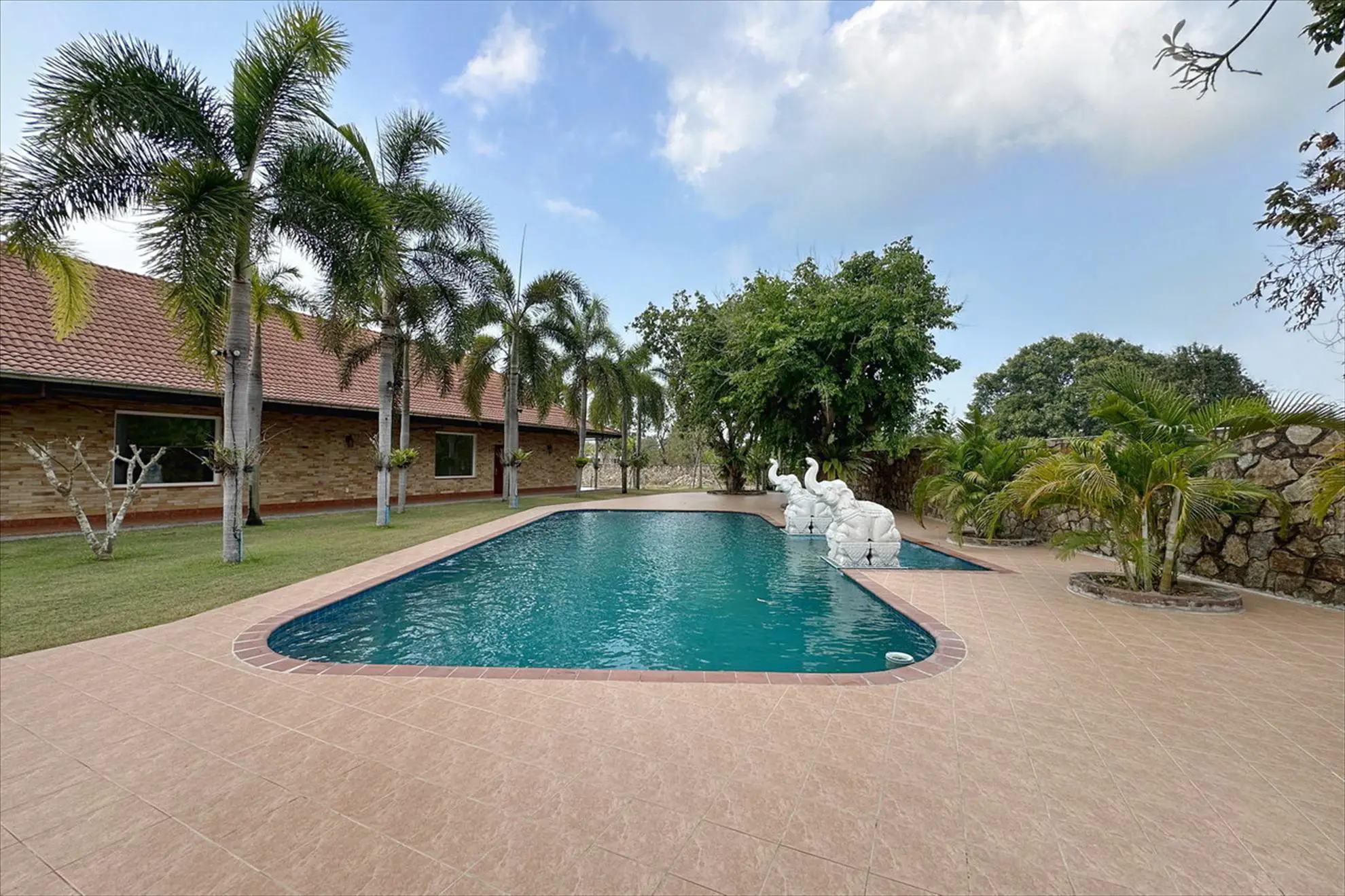 Situated on 5 Rai 389 Tw2 (9,556 sqm) of land, the property includes a main house, a separate guest house, and an outbuilding, all surrounded by beautifully landscaped tropical gardens.