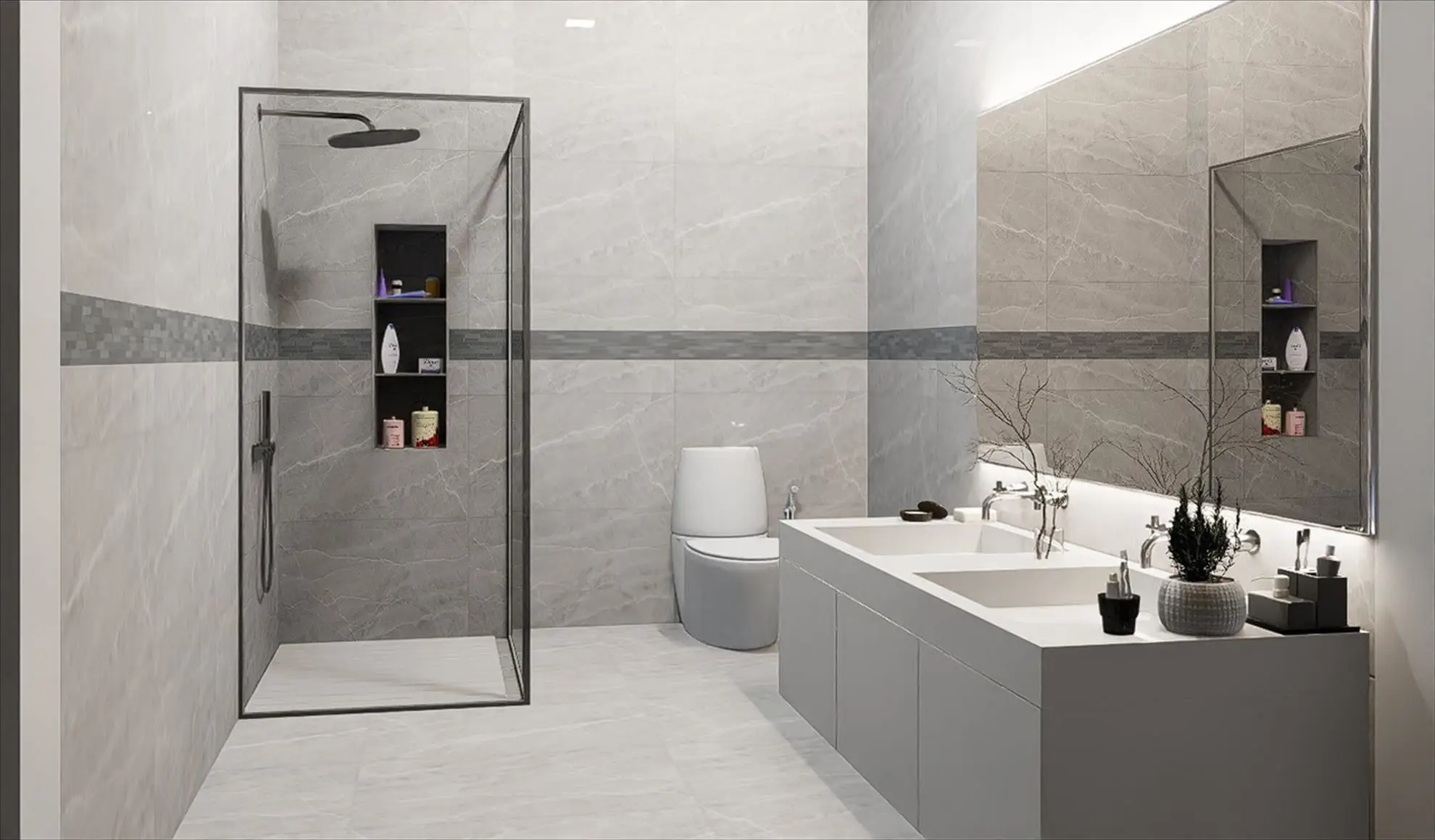 Ensuite bathroom with twin wash basins and glass shower cubicle