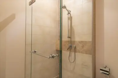 The second bedroom also features built-in wardrobes and its own ensuite bathroom with a glass shower cubicle