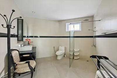 En-suite Bathroom with twin wash basins and side by side shower cubicle