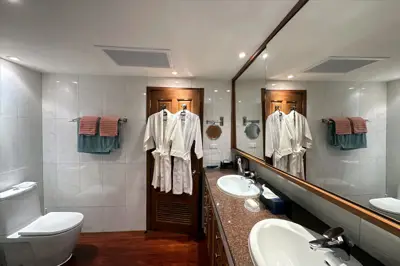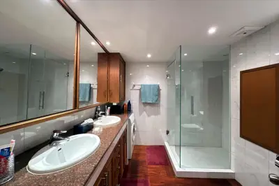 En-suite bathroom with twin wash basins, glass shower cubicle and washing machine