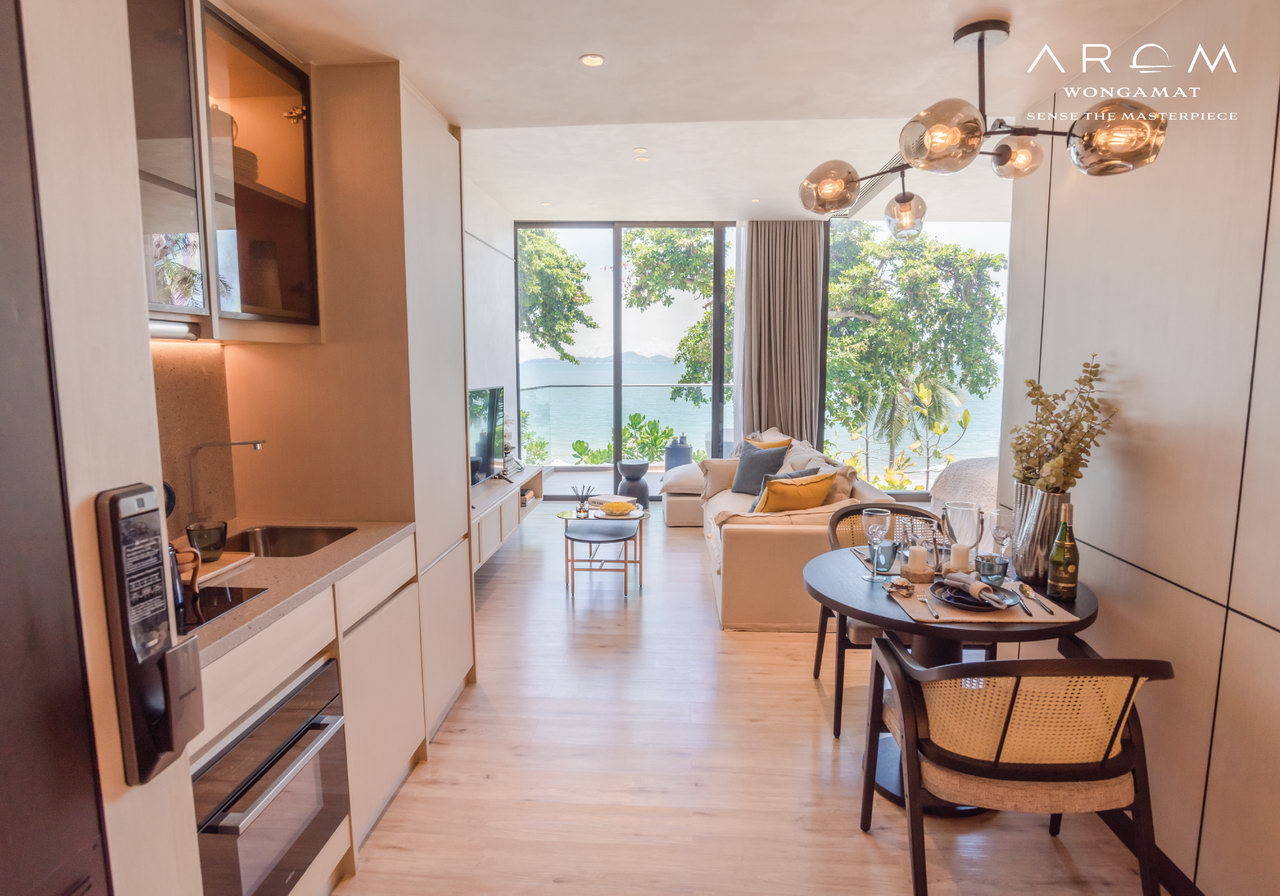 New Arom Wongamat Luxury Condo for Sale, Absolute Beach Front, Ready to Move In, 51 to 63 sqm, 1 bed, 1 bath, European kitchen, Built-ins, Balcony, Sea View * Prices from: 16.479 M Baht