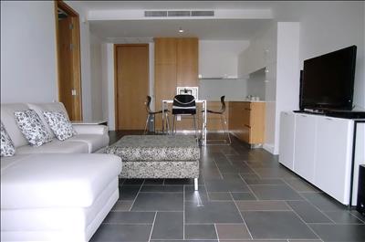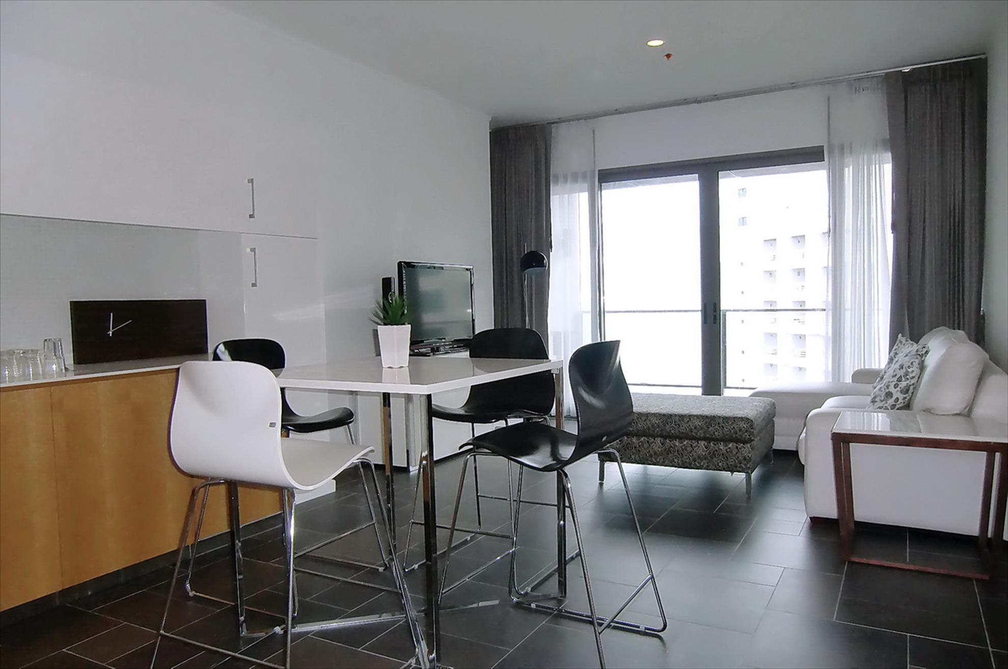 Open plan living room with lounge and dining areas, balcony,