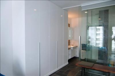 Bedroom with built in wardrobes, opening side door to balcony,