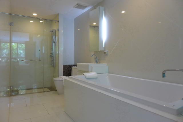 En-suite bathroom with separate bath tub and glass shower cubicle